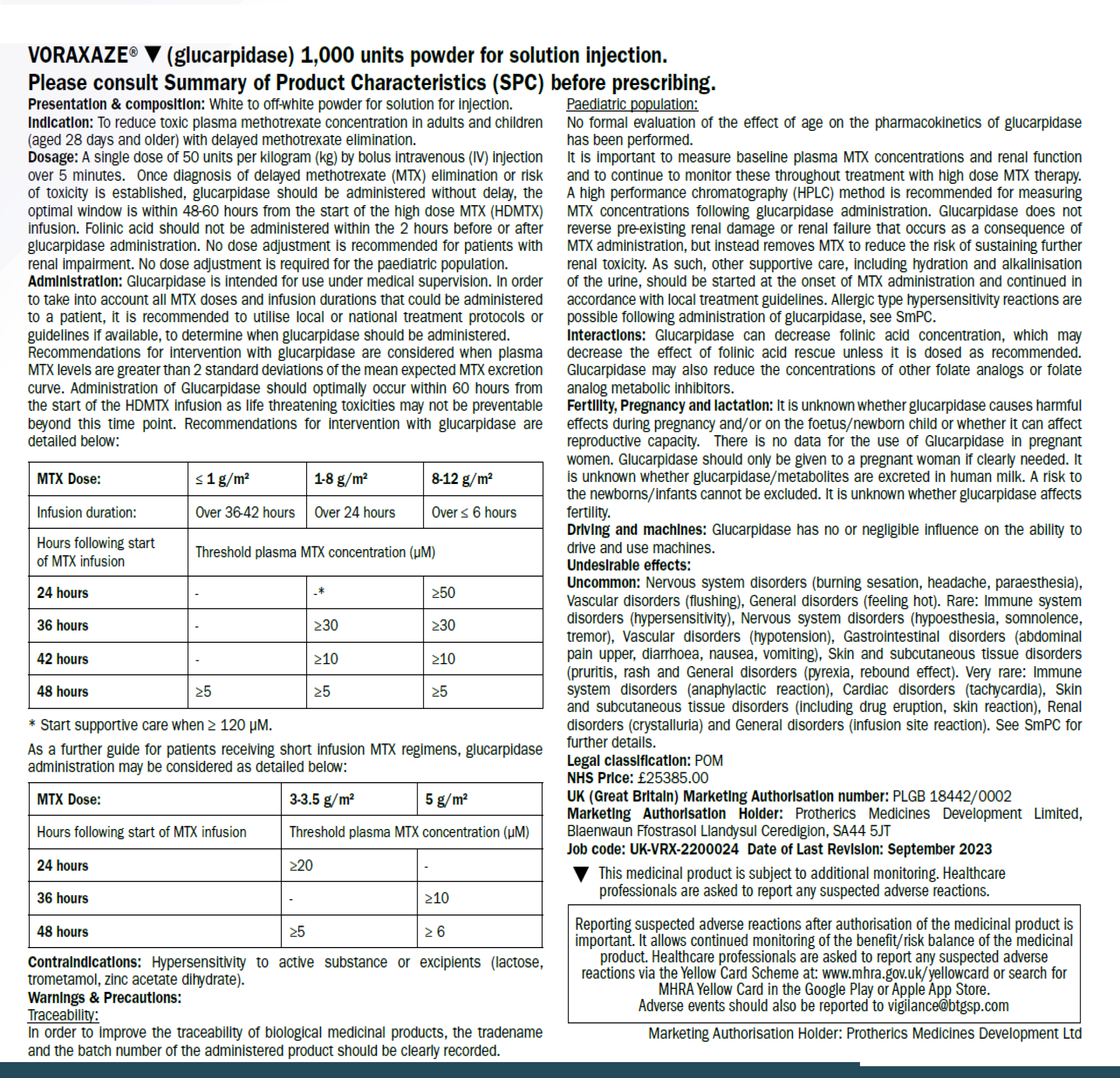 | Product | Voraxaze (glucarpidase) 1,000 units powder solution for injection |